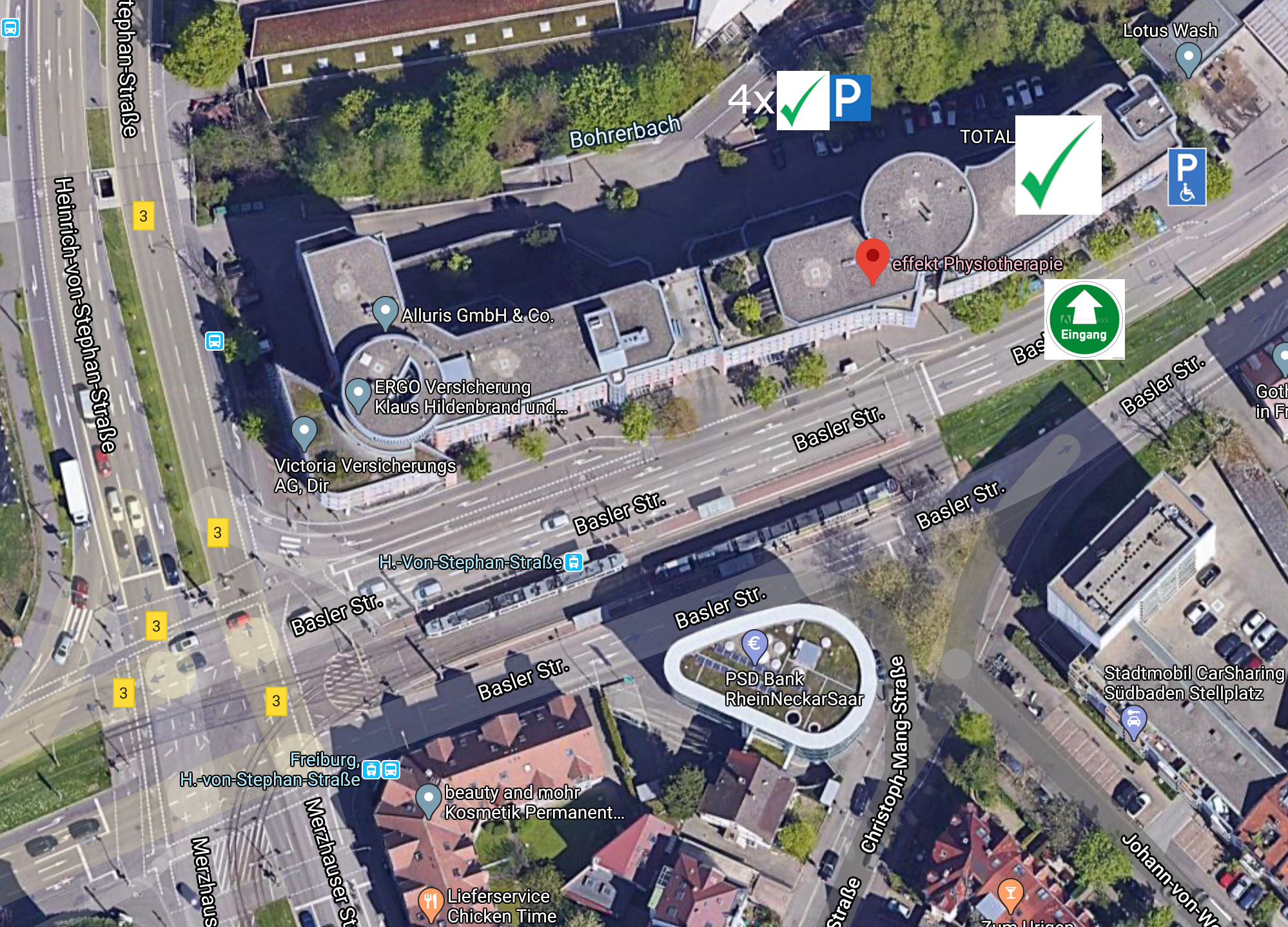 Unsere Praxis ist zentral gelegen, so dass sie gut mit dem PKW, den Öffentlichen Verkehrsmitteln, dem Rad oder zu Fuß zu uns kommen können. Sie finden uns im Erdgeschoss des Victoriahauses in der Baslerstraße 61. Natürlich verfügen wir über einen barrierefreien Eingang.